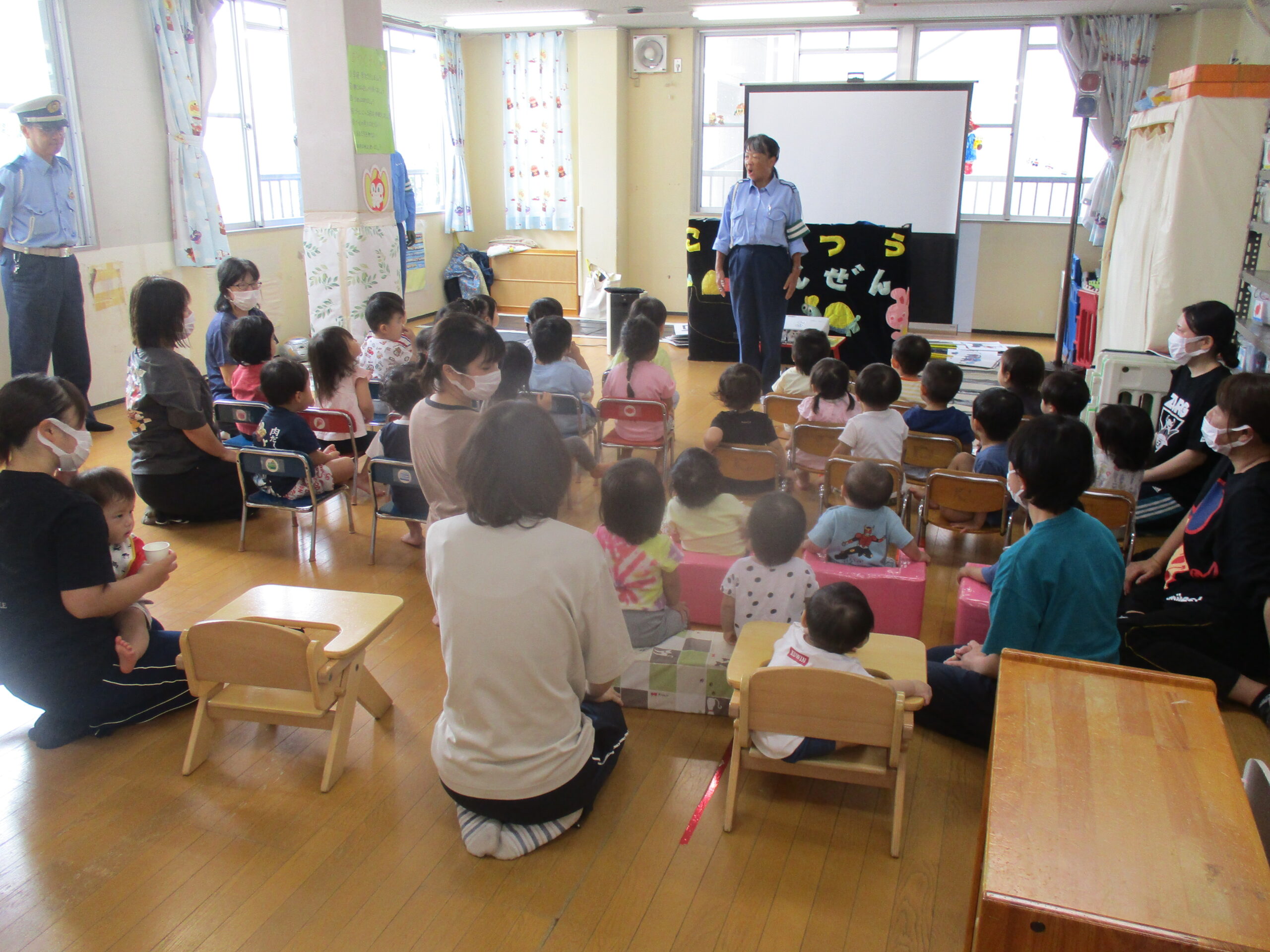 警察官や交通安全課の方々に来ていただき、交通安全に関するDVDを見たり、大切なお話を聞かせていただきました。