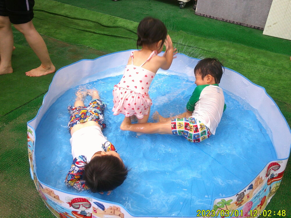 全身遊びで水の気持ち良さを感じたり、「ぷにぷに」「ぷるぷる」と感触を言葉にしながら友達と笑い合ったりする姿がありました。