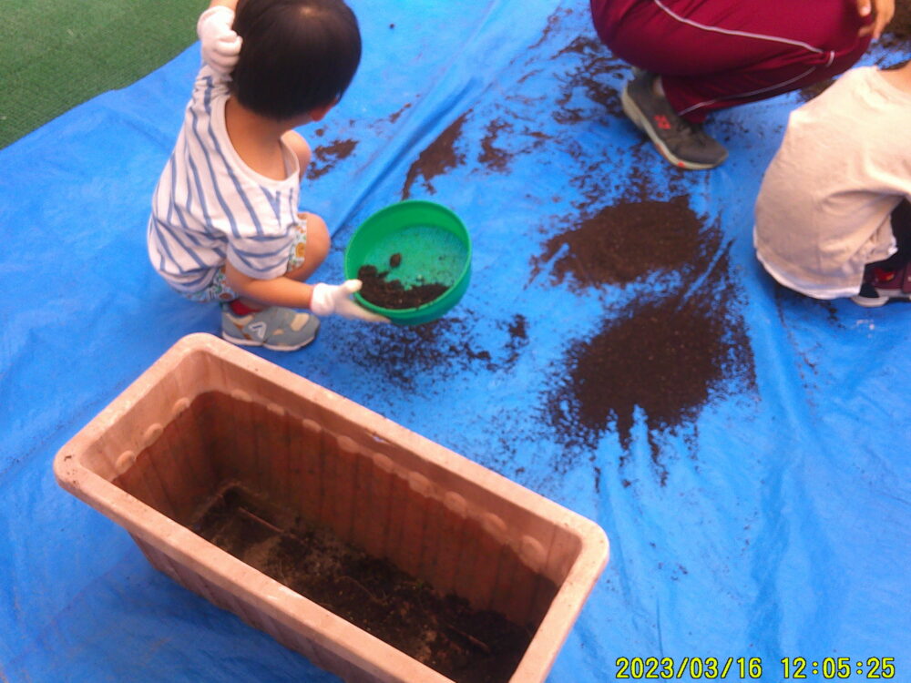 ふるいを使って沢山の土をふるいしながらフカフカの土のお布団を作りました。