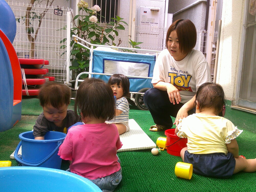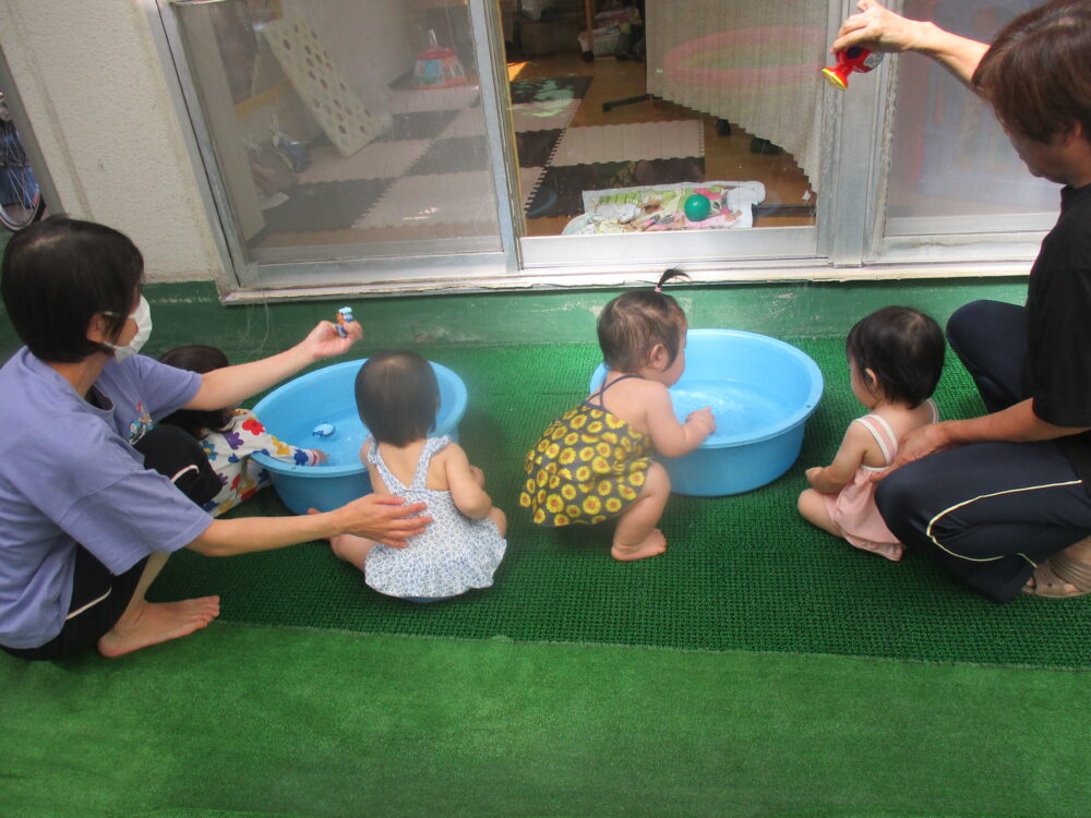 夏は片栗粉や小麦粉粘土、寒天などの感触遊びをしました。感触遊びの他にも水遊びに興味を持つと水に触ろうと手を伸ばし、タライの中に氷を入れると触っては、「キャーッ!」と大喜び!冷たさを存分に味わっていました。