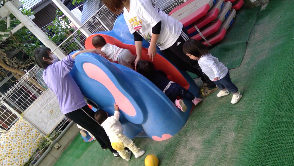 高月齢児のお友達は靴での歩行に慣れてしゃぼん玉を追いかけたり、滑り台に登ったりとどんどん動きが大きくなってきました。