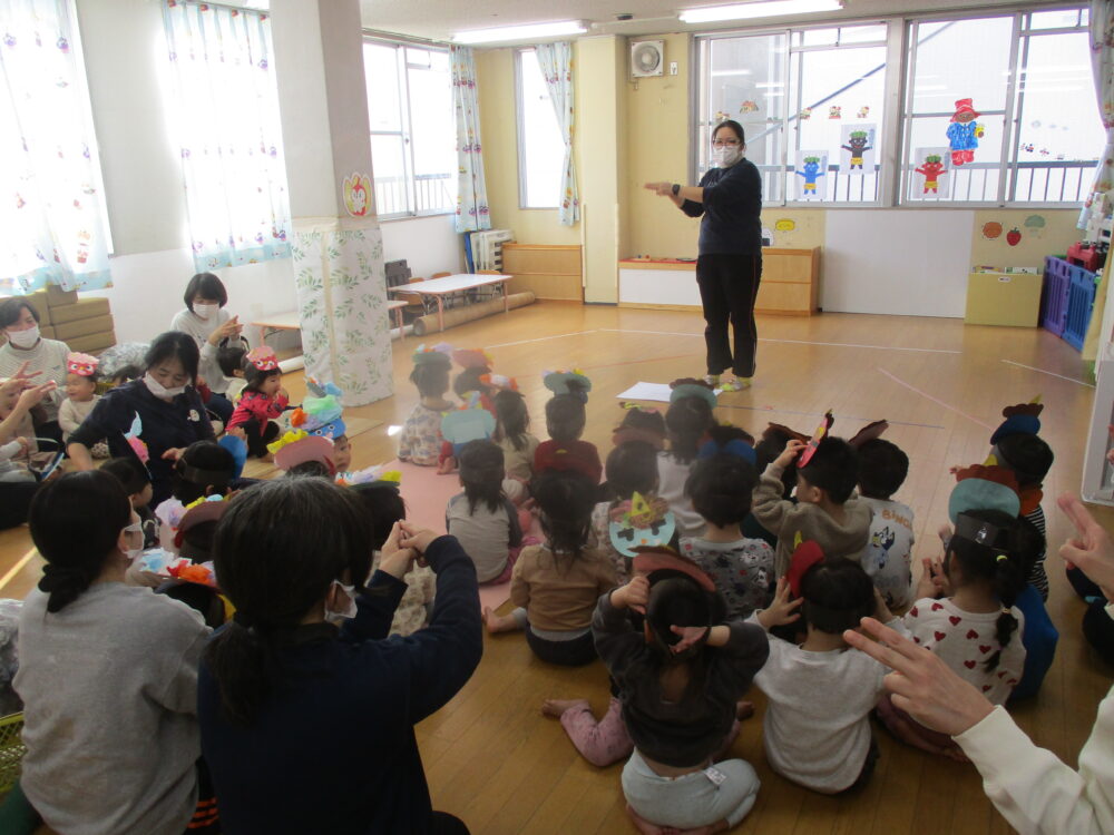 各クラスで作った鬼のお面紹介の後、どうして節分に豆まきをするのか等のお話を聞きました。