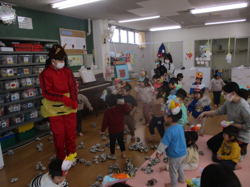 「鬼は~外!福は~内!」と新聞紙の豆を投げました。最後は仲直りをして鬼さんも一緒に歌をうたったり、記念撮影をしたりしました。