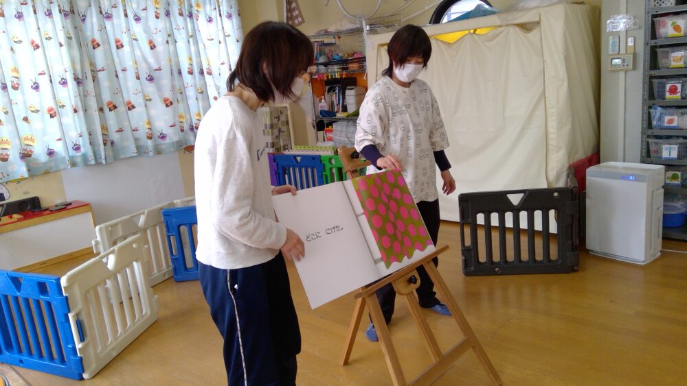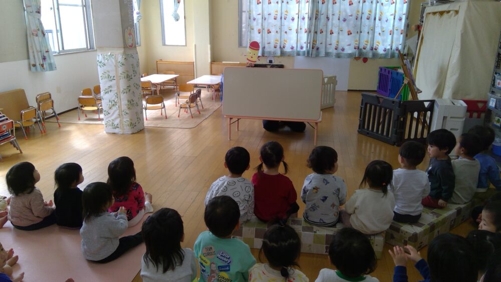 今回の青空保育は雨上がりだったので公園には行かず、保育園で「どんな色がすき」のペープサートと「きんぎょがにげた」の大型絵本を見ました。
