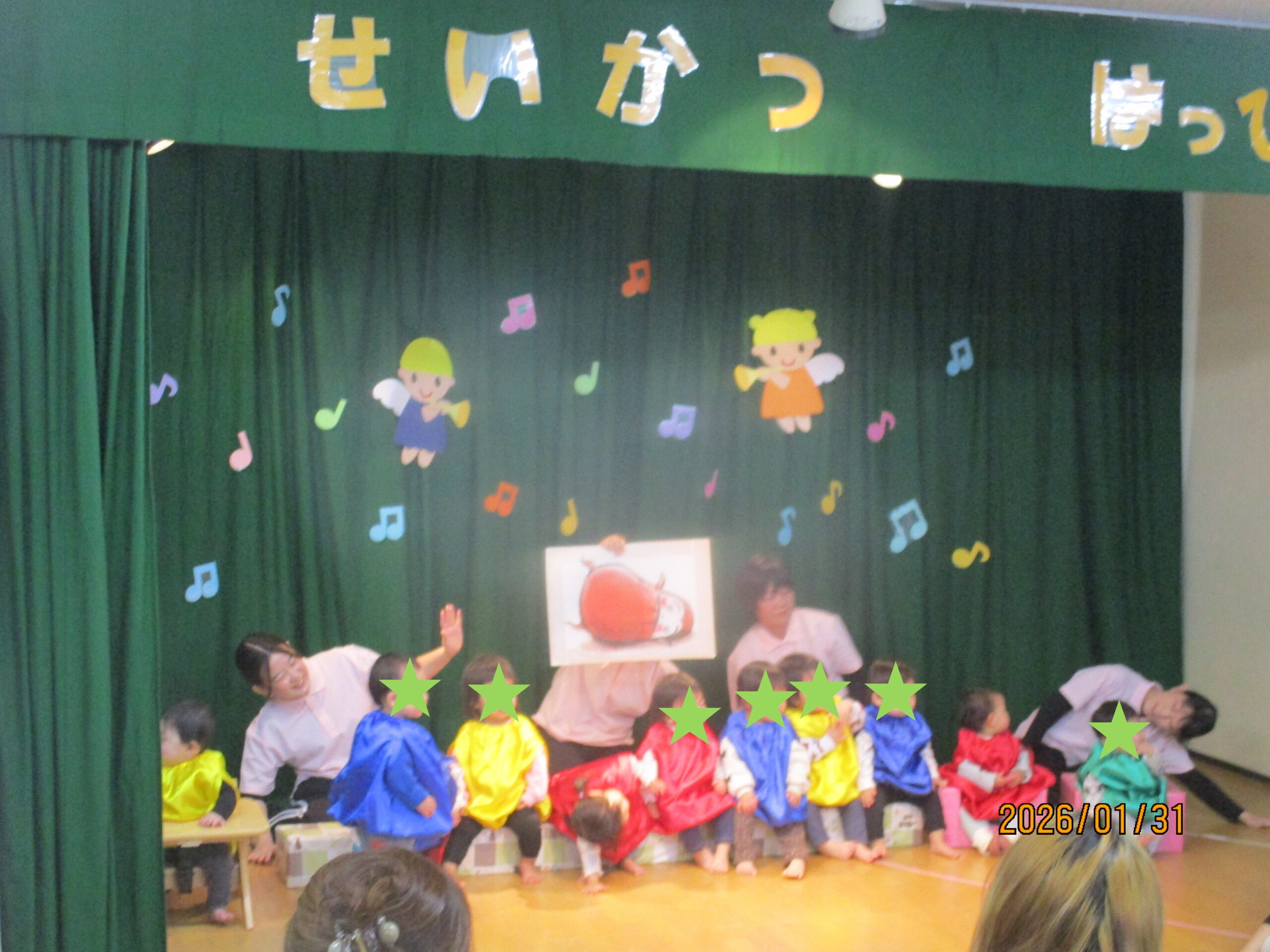 1月は初めての生活発表会がありました。少し緊張していた子どもたちですが、普段取り組んでいる“朝の会”が始まると、歌に合わせて身体を揺らしたり、絵本に合わせて身振りをしたりと楽しんでいました!