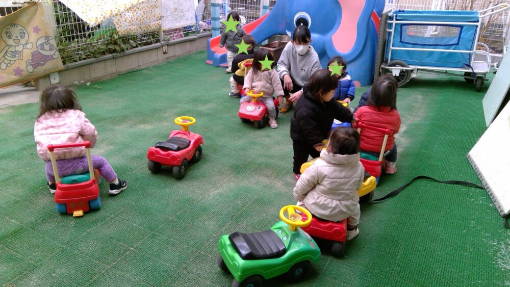 2月・3月は園庭でピーターカーやボール遊びをしたり、室内で運動遊びをしたりしました!また気候が良い日にはお散歩へ行き、菜の花を見たり、砂遊びをしたりして遊びました!