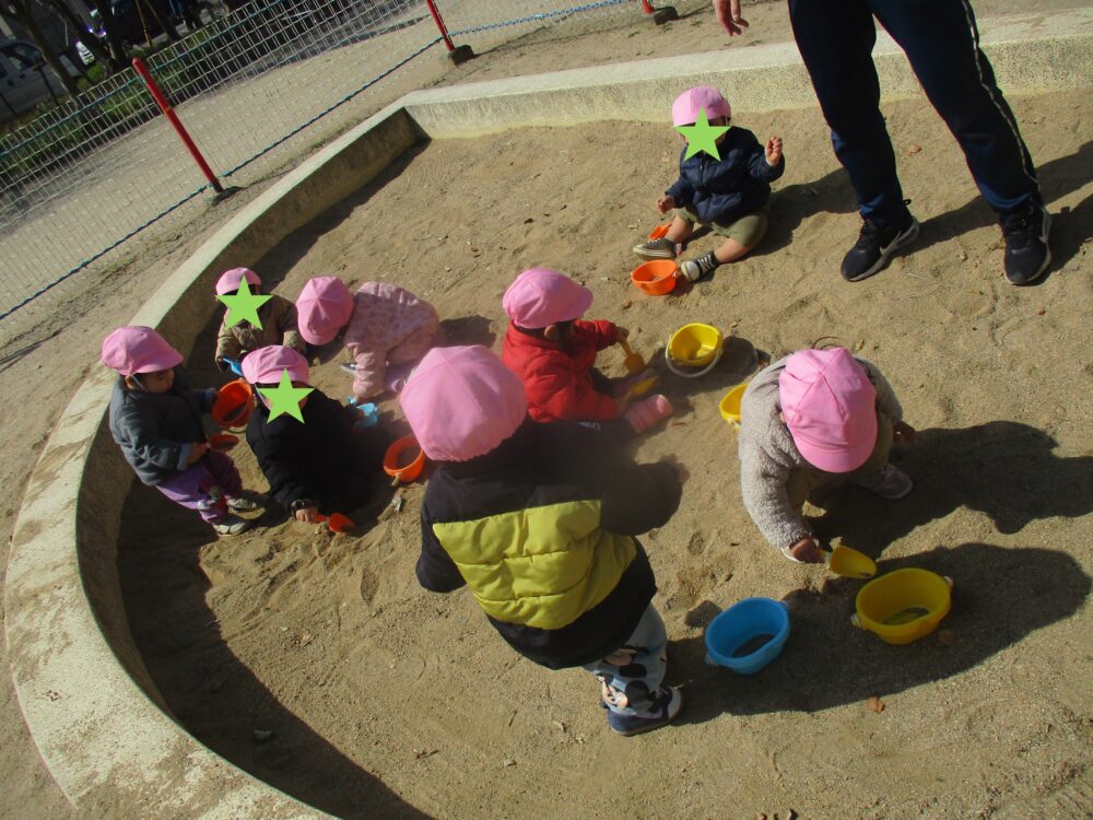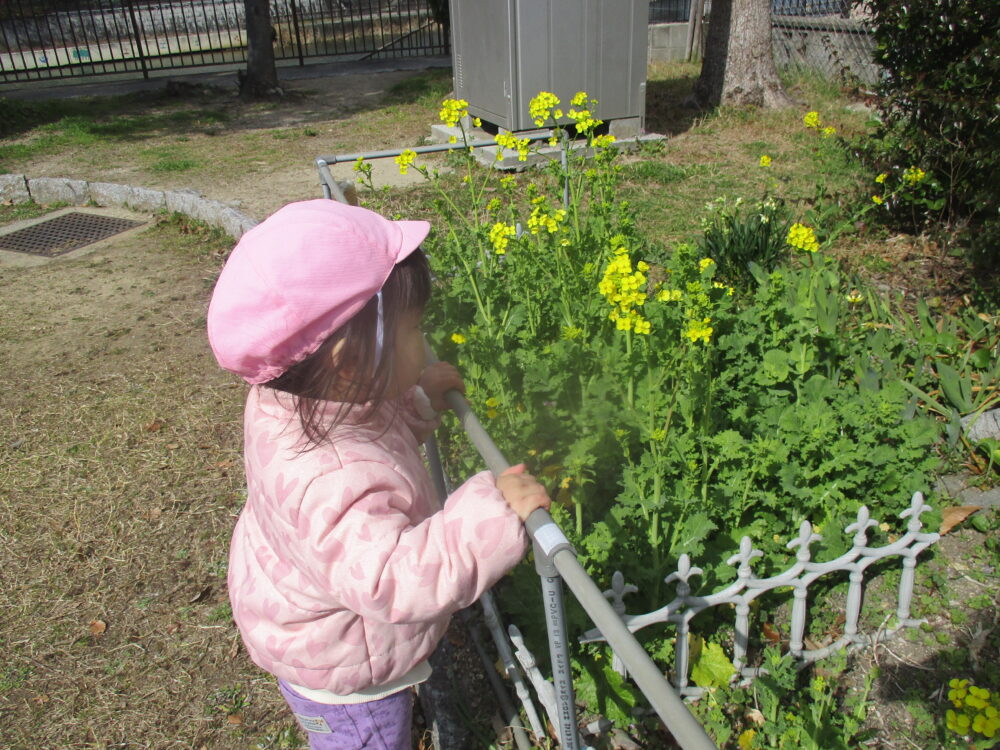 2月・3月は園庭でピーターカーやボール遊びをしたり、室内で運動遊びをしたりしました!また気候が良い日にはお散歩へ行き、菜の花を見たり、砂遊びをしたりして遊びました!